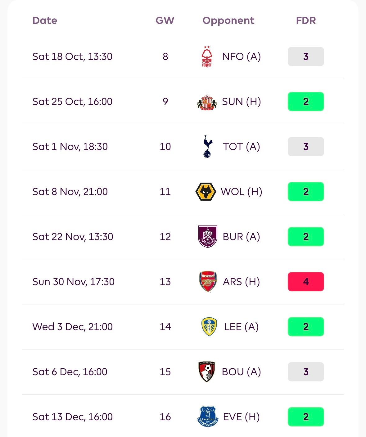 Next Up, also at Chelsea, it is being reported that Palmer is targeting a return to play at some point during November and will not need surgery but is still “weeks” rather than “months” until he will be ready. My best guess is Gameweek 12 after the next International Break we might see Palmer back being able to start for Chelsea. There are so good fixtures between now and then for other potential picks in Joao Pedro and Enzo Fernandez.