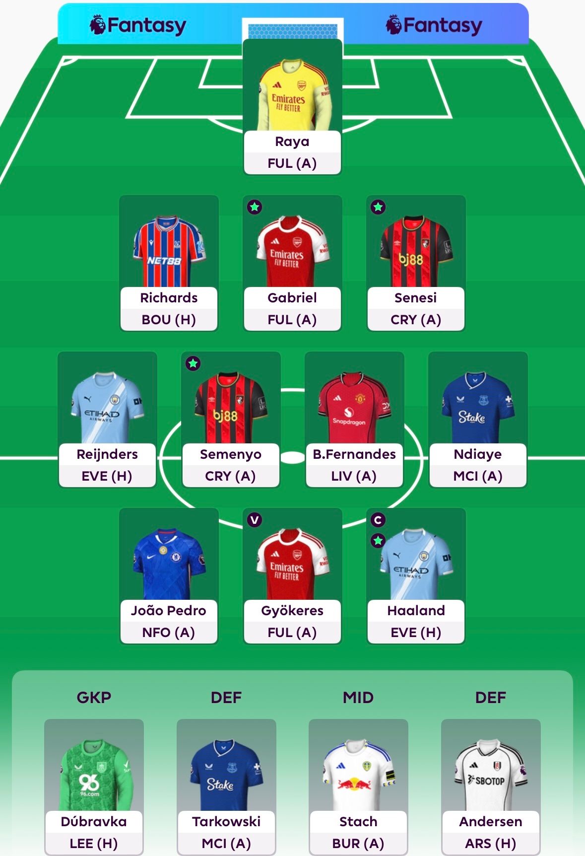 As long as no issues arise between now and the deadline the plan is to bench boost in GW8 after the break. Dubravka with LEE (H), Mukiele with WOL (H), Stach with BUR (A) and Andersen for ARS (H).