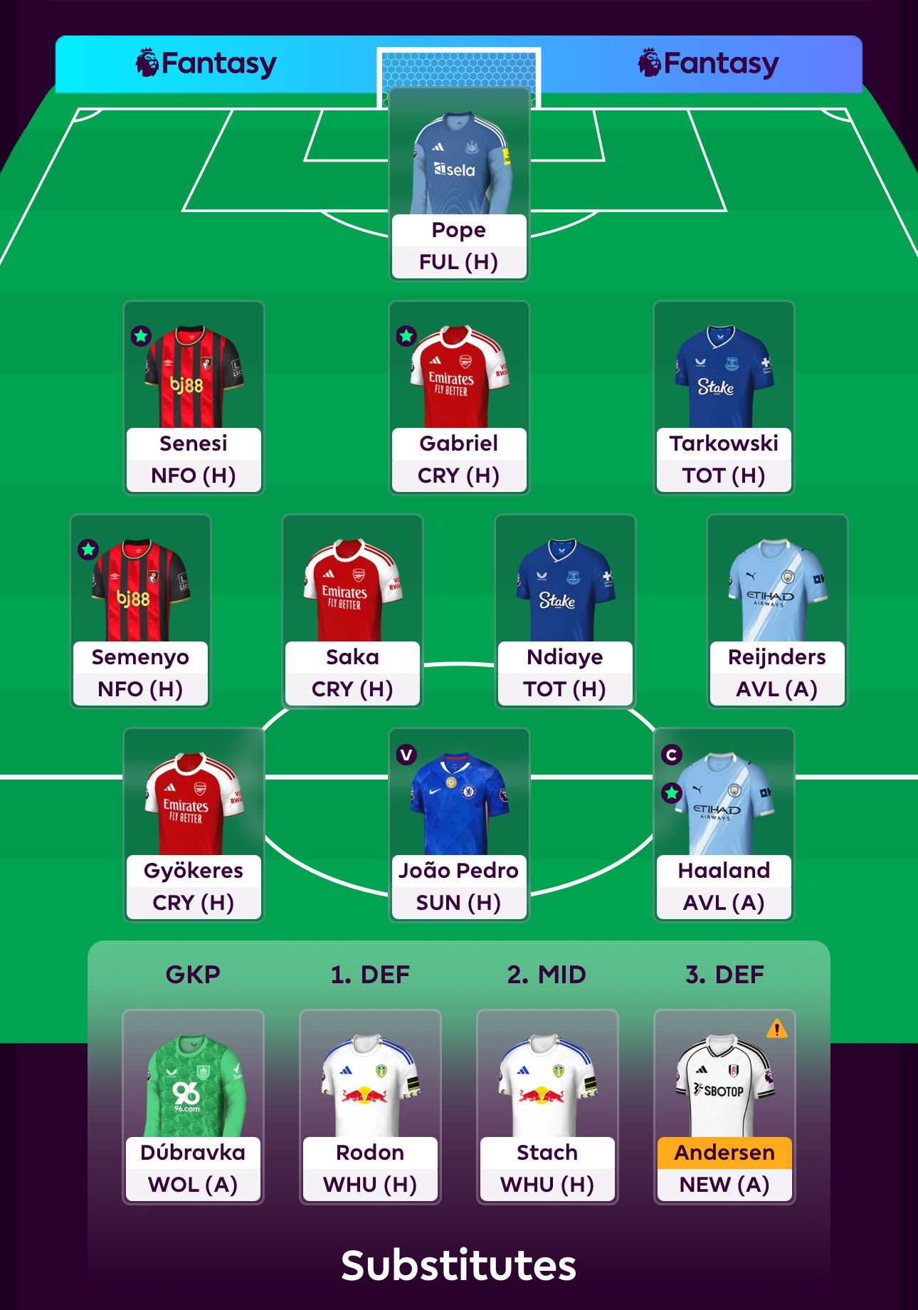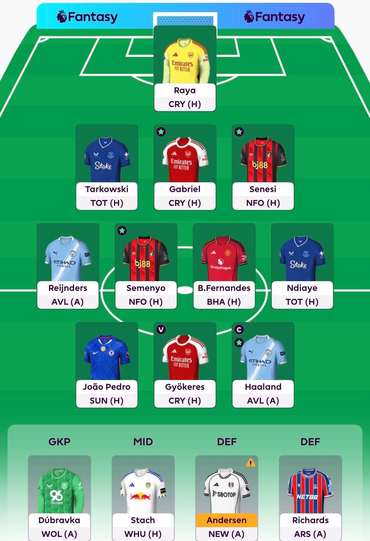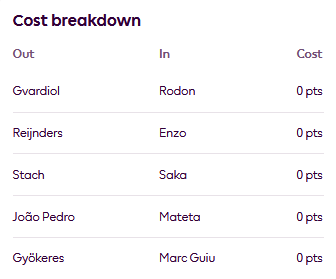Richards and Keane look the best long term, both have a bad fixture this week. Keane’s is better with TOT (H), though it’s not as simple as that. I’m looking to sell Joao Pedro to Mateta in GW10 potentially for Palace’s fixture swing, plus I may want to swap Gyokeres and Stach to Guiu and Saka. The problem with selling Gvardiol for 4.5m defender is it leaves 0.1m wiggle room for all those moves. I’m therefore looking at Rodon who has WHU (H) this week and ensures I should be able to make all the moves below if I want to. Don’t get me wrong - I hope I don’t want to sell Gyokeres, but if he blanks again this gameweek and Saka hauls it’s going to be hard to ignore that switch. Gyokeres did score a brace in the Champions League, not the most glamorous brace but they all count - hoping that can spill over to some league form next.