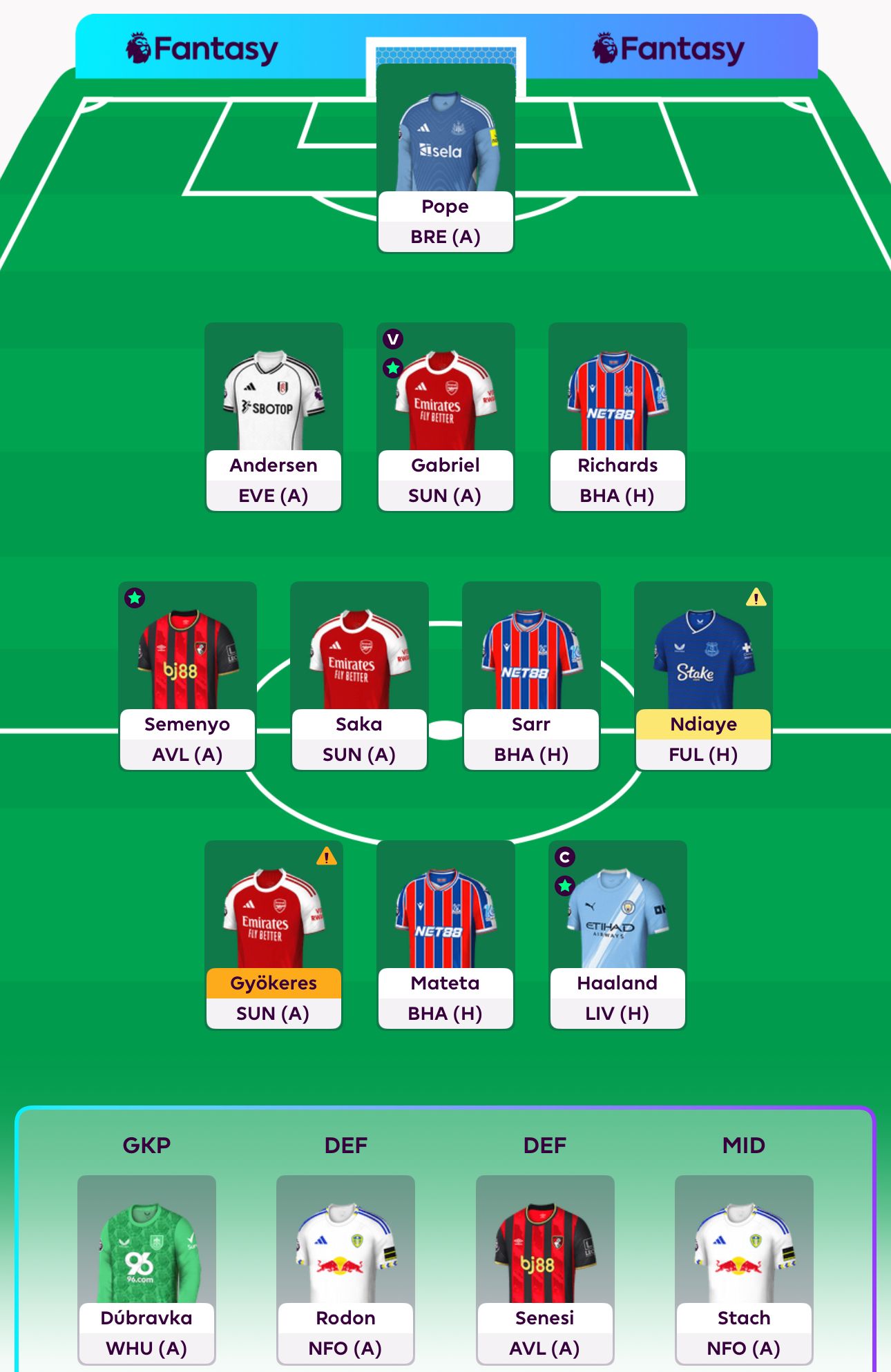 Now the benefit to Sarr is it gives me an extra week to look and decide which Arsenal midfielder I might want and can then sell Ndiaye before his difficult fixtures start for either Saka or Rice. However this does feel that I am just pushing a decision another week down the line that I could make this week.