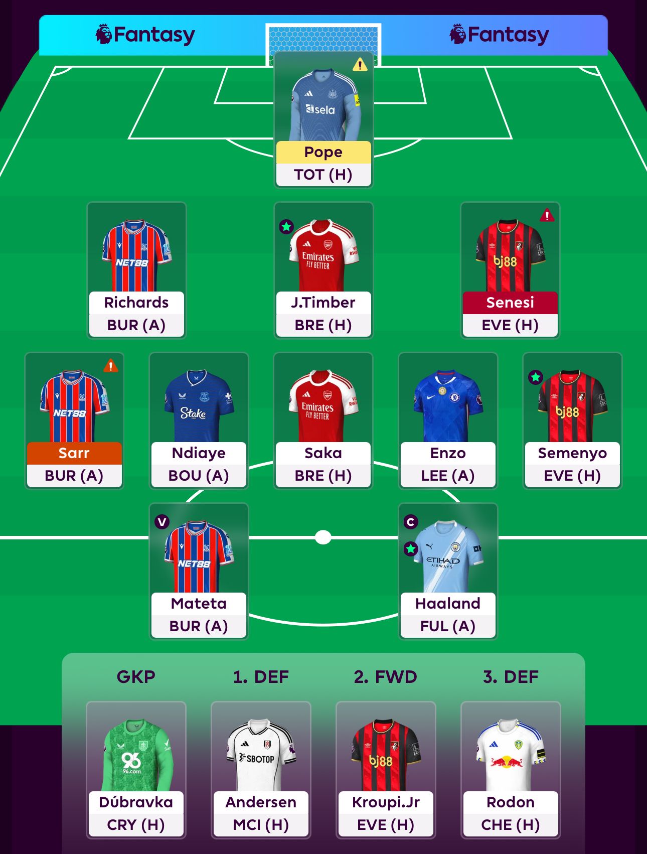 I have 3 flagged players in Pope, Senesi, and Sarr. I think the biggest issue and the player which opens up the most options would be Sarr, and I am 90% sure I will be buying Bruno Fernandes. I think he is an excellent option this week, and long-term you always know he will be on the pitch.