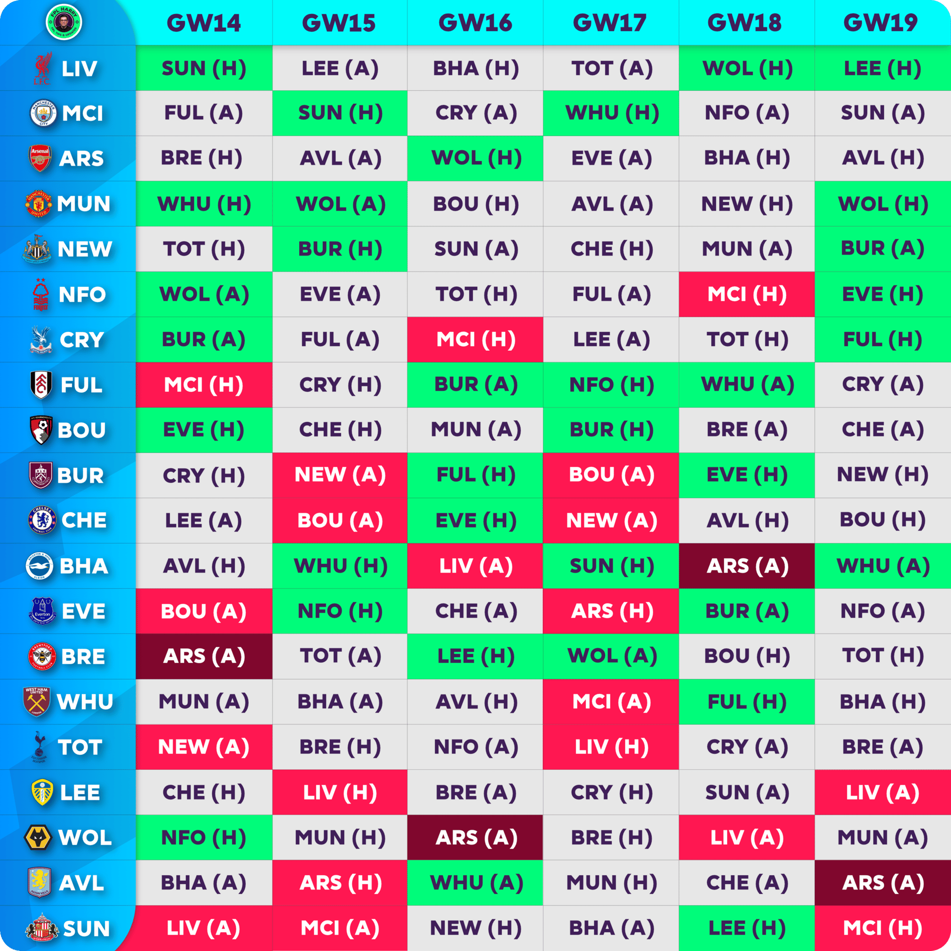 Absolute triple captain disaster but all things considered a good week to still half my rank to 36k. Well done to Harry and Ross copying for each other (just kidding). I’m actually looking at GW15 for my free hit, Man City have SUN (H), Man Utd have WOL (A), Newcastle have BUR (H) so that will be the core of the free hit.
