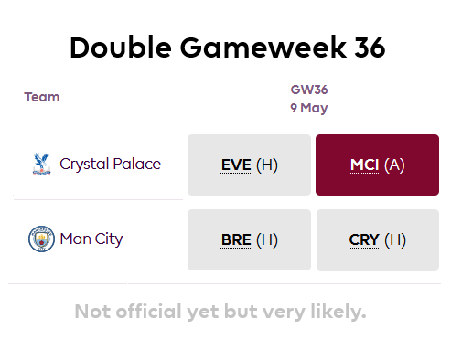 Double Gameweek 36 is not confirmed, but very likely. Crystal Palace and Man City have their postponement to be rearranged still, which will definitely create a DGW, and GW36 is the likeliest week.